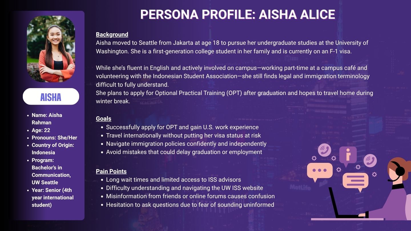 ISS Connect is a conversational AI assistant built for international students at the University of Washington. It helps them navigate U.S. immigration regulations — F-1/J-1 visa compliance, OPT/CPT work authorization, SEVIS records, and international travel — through natural, accessible language, available 24 hours a day.