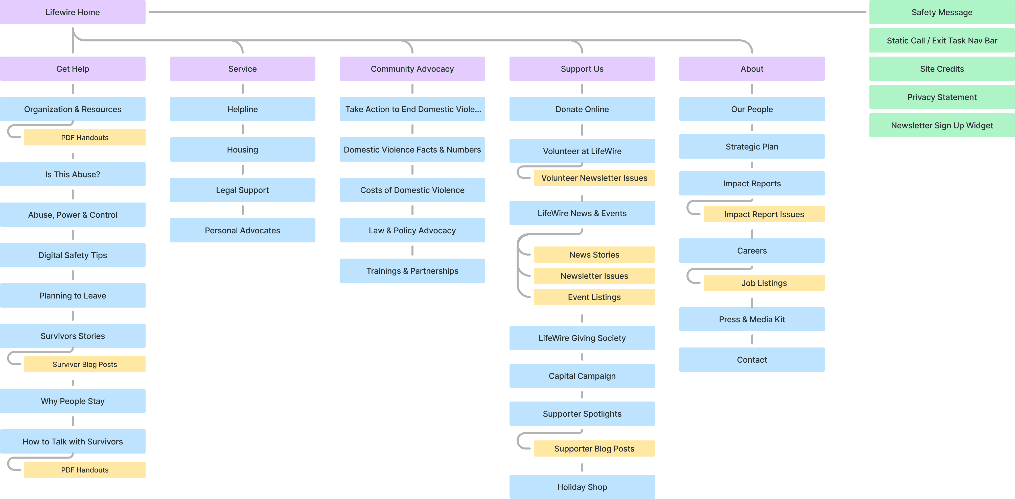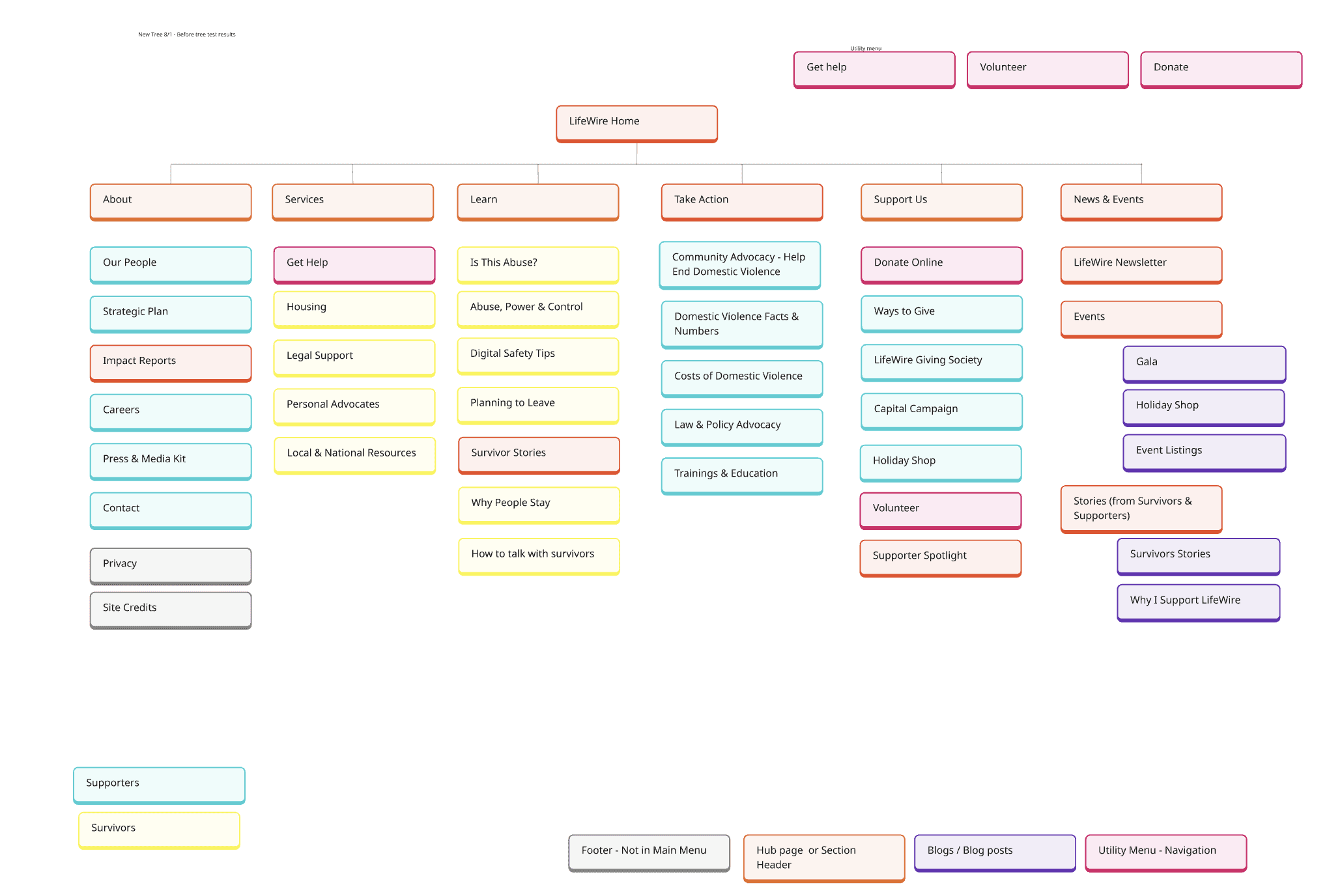 Restructure IA based on user needs and tasks, create logical categories aligned with audience segments (survivors/supporters), and ensure accessible navigation for all users.