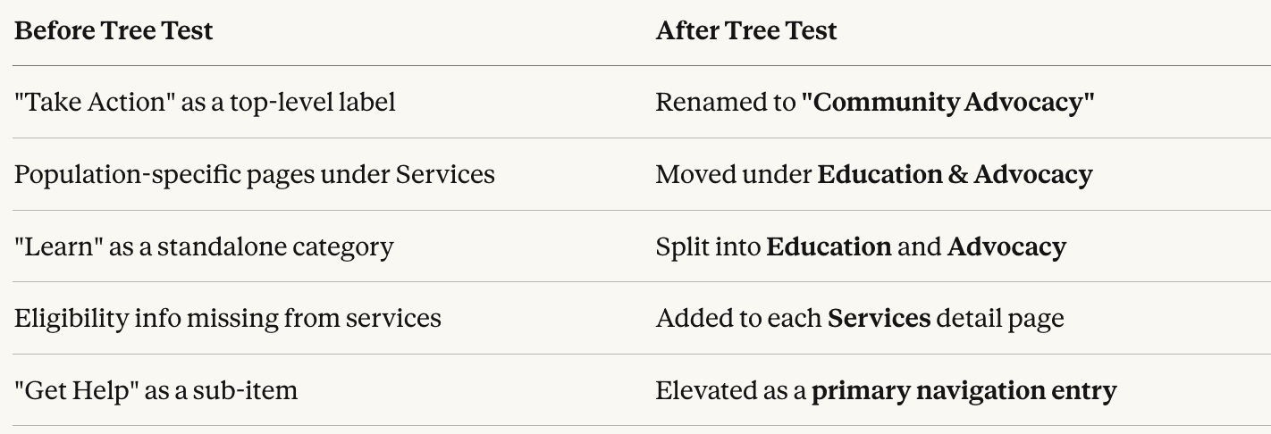 Tree testing didn't just validate — it gave us specific, evidence-backed reasons to revise our foundation before moving into visual design.