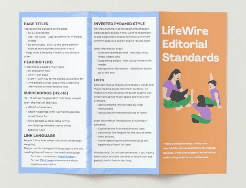 The redesign didn't end with a new sitemap. We developed Editorial Standards to ensure LifeWire's team could maintain the service-first experience over time — covering plain language guidelines, mobile-first writing principles, and content governance for different page types.