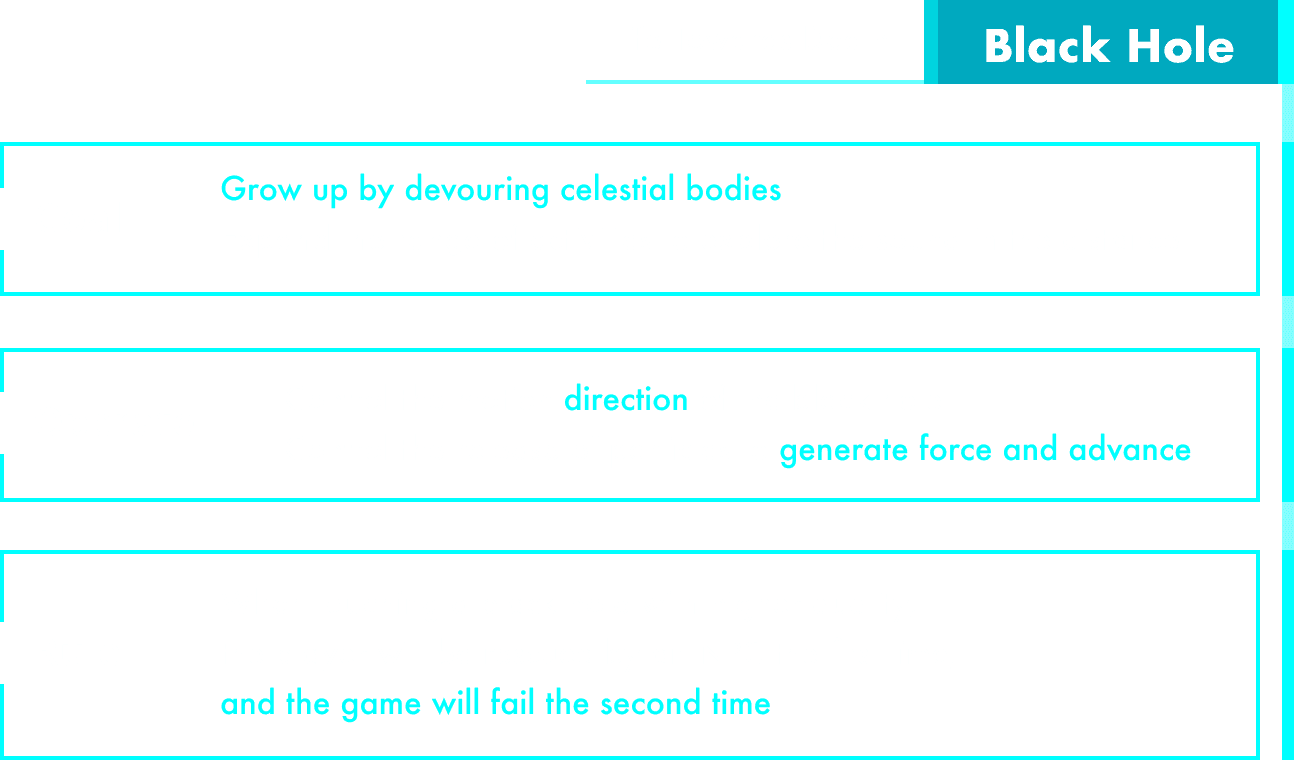 Devour celestial bodies to grow. Encounter a larger black hole. The NPC — a bond from a past life — appears on first failure. Grow to infinity, then explode. Scatter consciousness and memory.