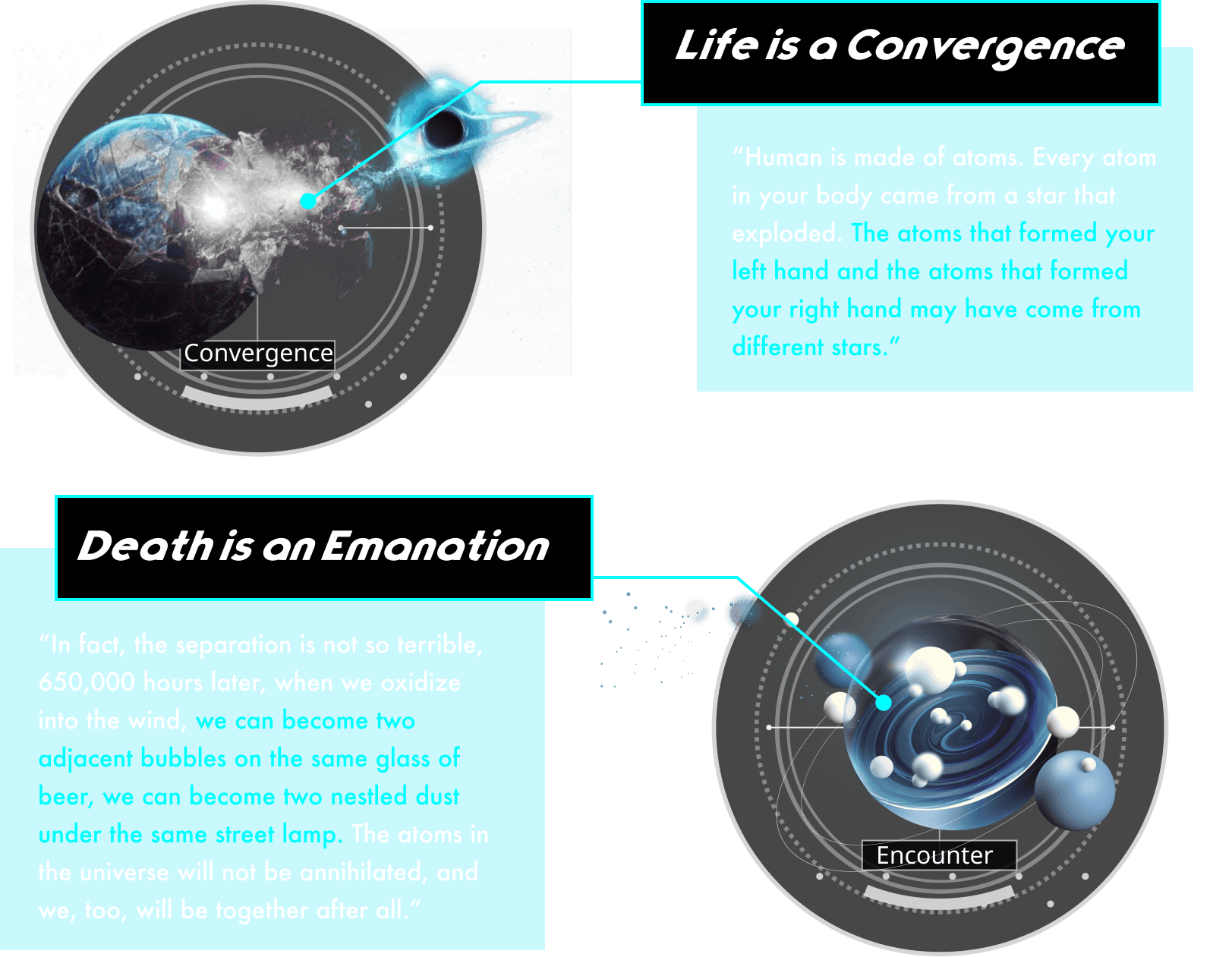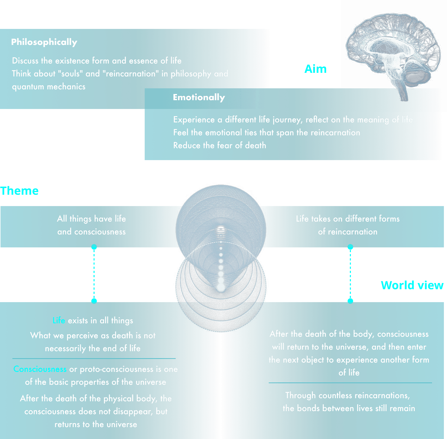 From the research, we built a world view with two pillars: all things carry life and consciousness, and life takes on different forms of reincarnation. After the death of the body, consciousness returns to the universe and enters a new vessel — carrying the bonds of previous lives.