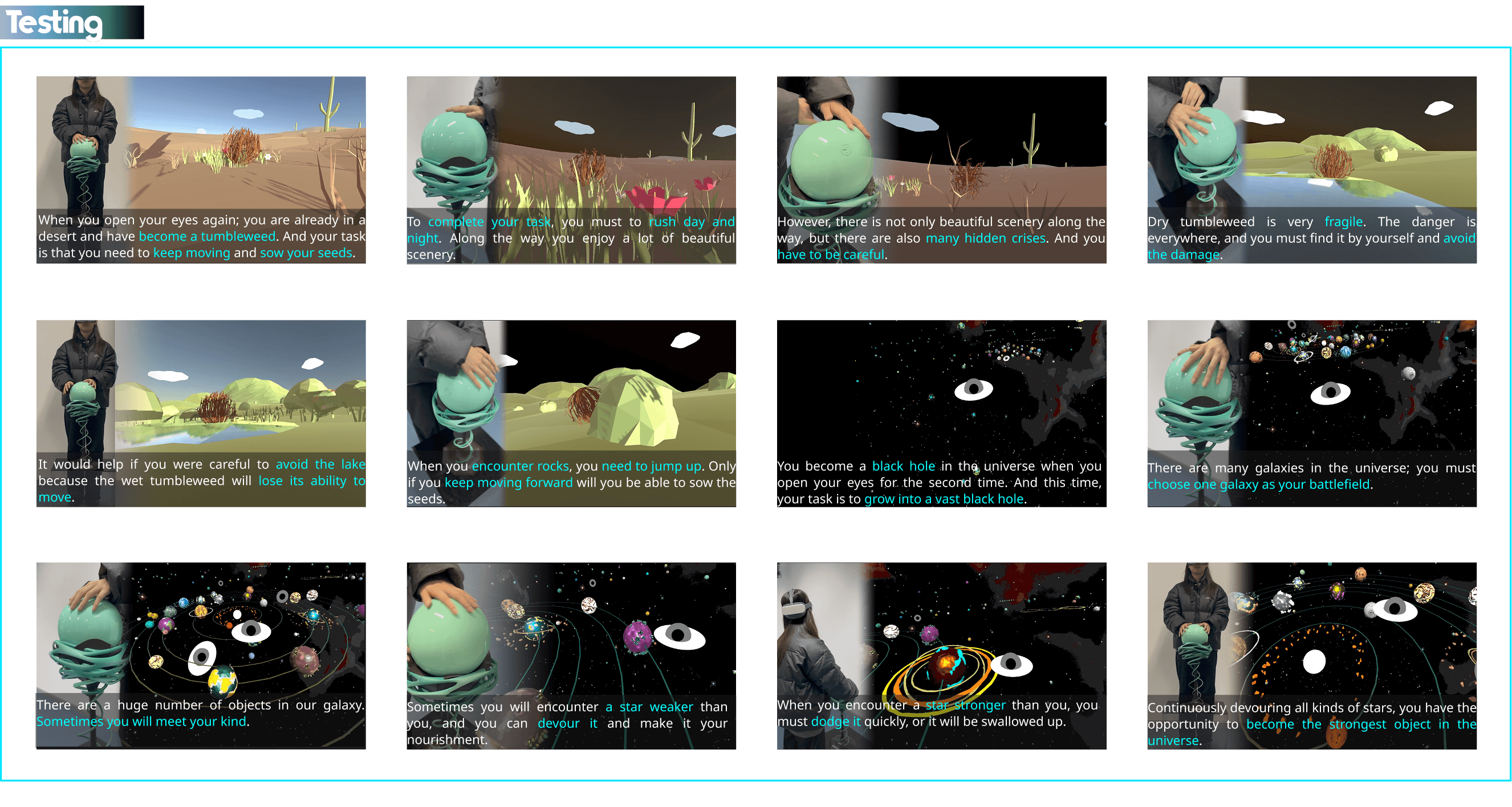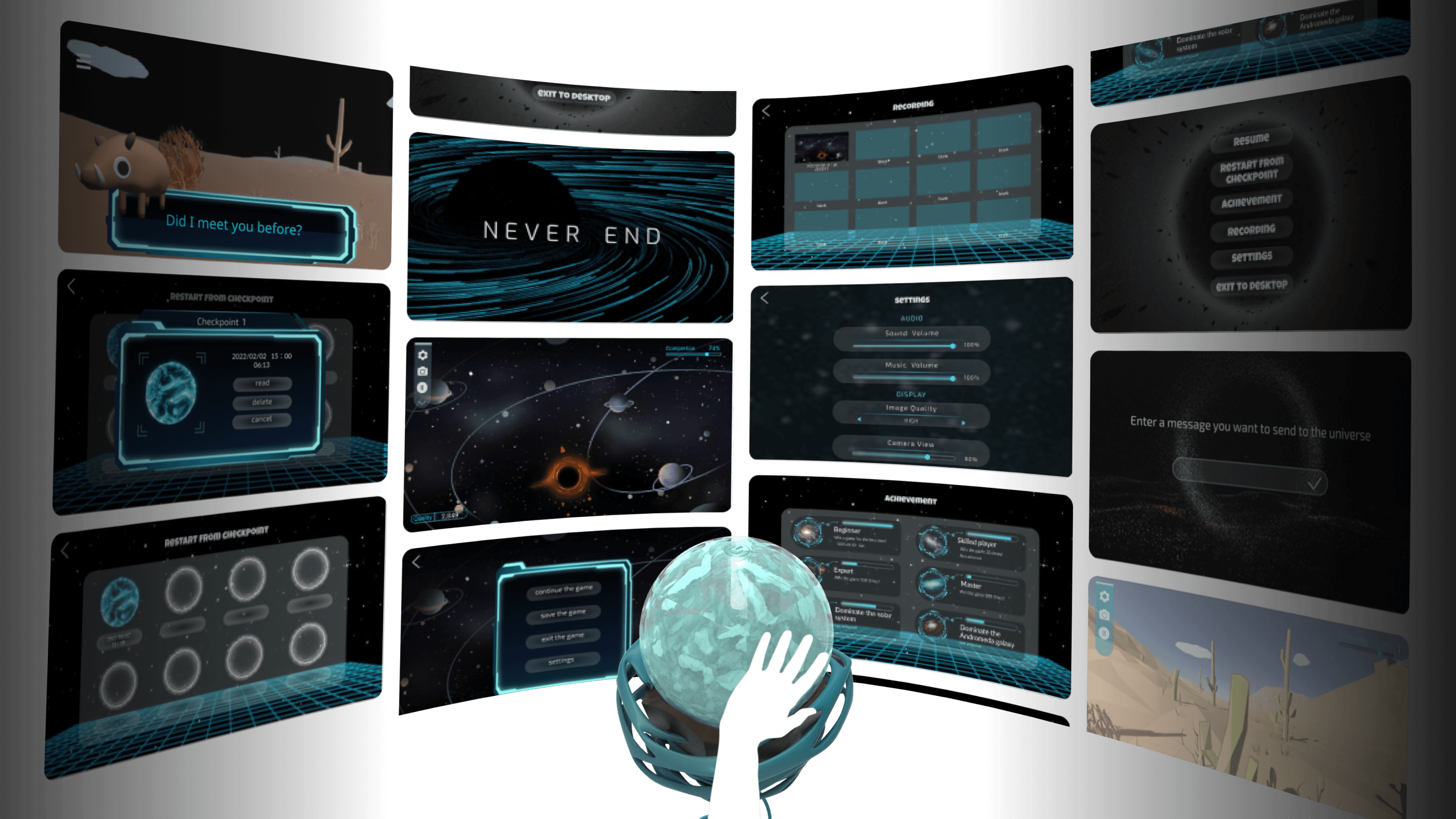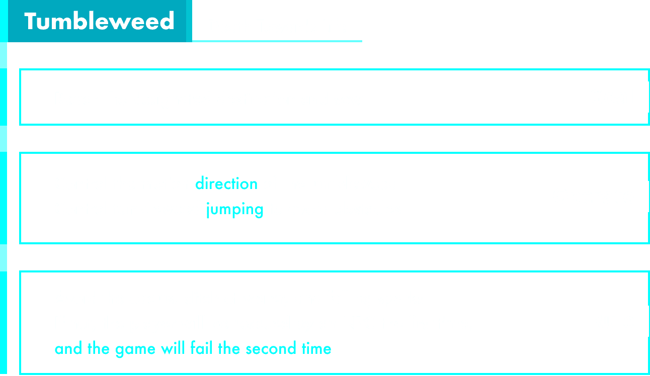 The pairing was also intentional: the black hole is life towards death — growing endlessly until collapse. The tumbleweed is death towards life — already dying, yet completing one final act of creation by sowing its seeds. The two roles mirror each other philosophically, so players who complete both feel the full cycle of the world view.